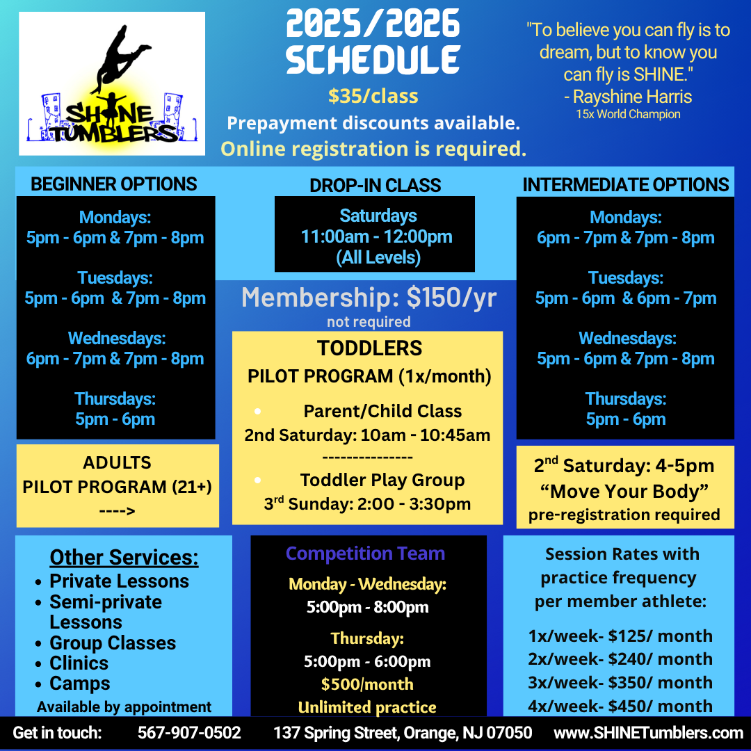 SHINE Tumblers offers classes that focus on skill development, safe technique, advancing talent, and building confidence.