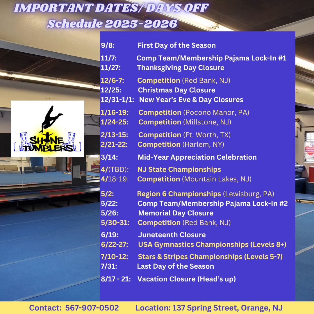 *Only first time parents/guardians are allowed in the gym. There are huge windows to observe practices from the outside.